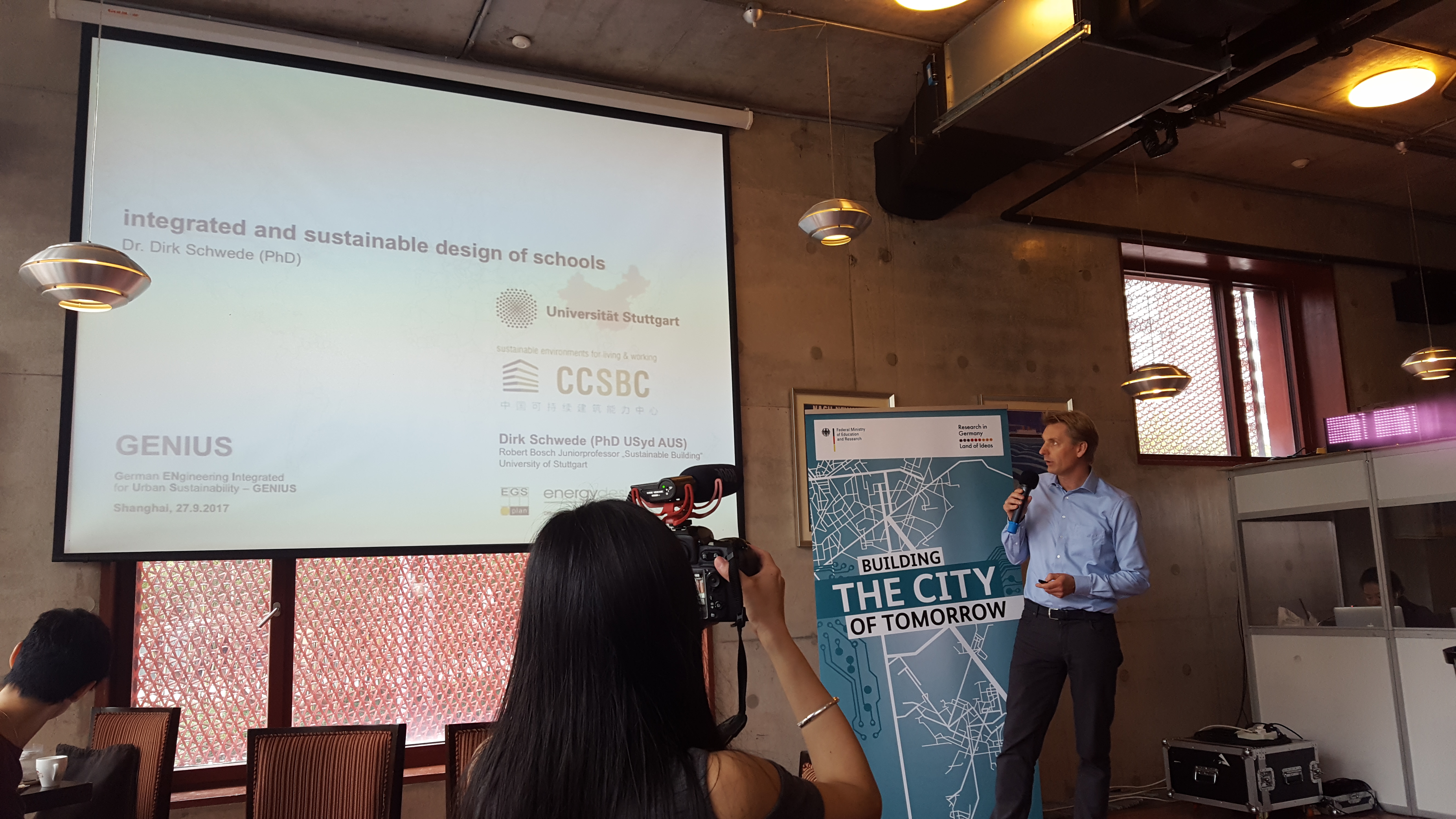 The GENIUS Project has kicked off in China, hosted by ILEK Stuttgart, CCSBC, Constellations, and energydesign. A workshop was held on 26th and 27th September at the Hamburg House at Shanghai’s Expo Site, where around 50 participants discussed about sustainable planning and design for schools in China. Architects, engineers and designers, as well as teachers, principals and scientists found together in small groups to explore innovative planning games to build better and more sustainable school environments for its users and the surrounding cities. Examples from Germany and China were discussed, including the EuroCampus Yangpu, a high-quality foreign school in Shanghai designed by gmp with LEED Platinum and GBL 3-star certification, conducted by energydesign.