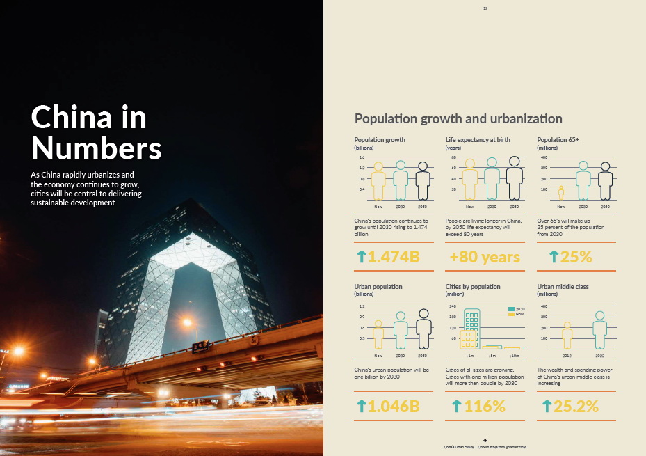 中国的城市人口正在增长:59%的人口已经在城市生活。到2050年,这一数字预计将增加到80%。中国政府正在推动智能城市的发展,已计入约500个试点项目。崭新的、可持续的移动解决方案,分布式能源生成,自动化废物管理,个性化医疗保健,数字集成 - 这些是中国城市未来发展的关键,也为德国高科技公司提供商机。