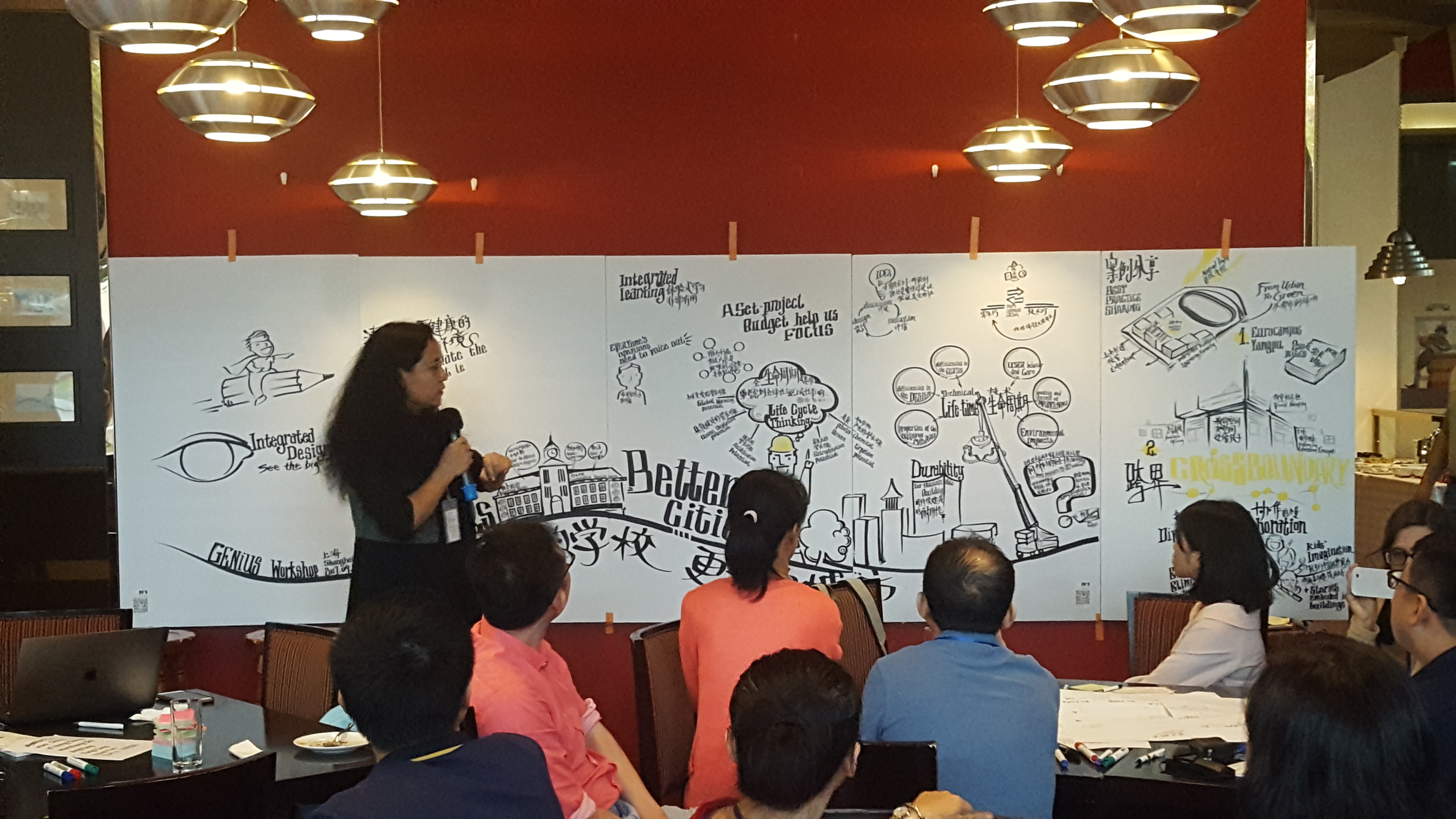 The GENIUS Project has kicked off in China, hosted by ILEK Stuttgart, CCSBC, Constellations, and energydesign. A workshop was held on 26th and 27th September at the Hamburg House at Shanghai’s Expo Site, where around 50 participants discussed about sustainable planning and design for schools in China. Architects, engineers and designers, as well as teachers, principals and scientists found together in small groups to explore innovative planning games to build better and more sustainable school environments for its users and the surrounding cities. Examples from Germany and China were discussed, including the EuroCampus Yangpu, a high-quality foreign school in Shanghai designed by gmp with LEED Platinum and GBL 3-star certification, conducted by energydesign.